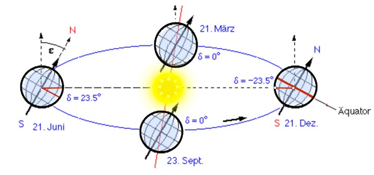 Je nachdem, wie die Achse zur Sonne steht, haben wir die vier verschiedenen Jahreszeiten.